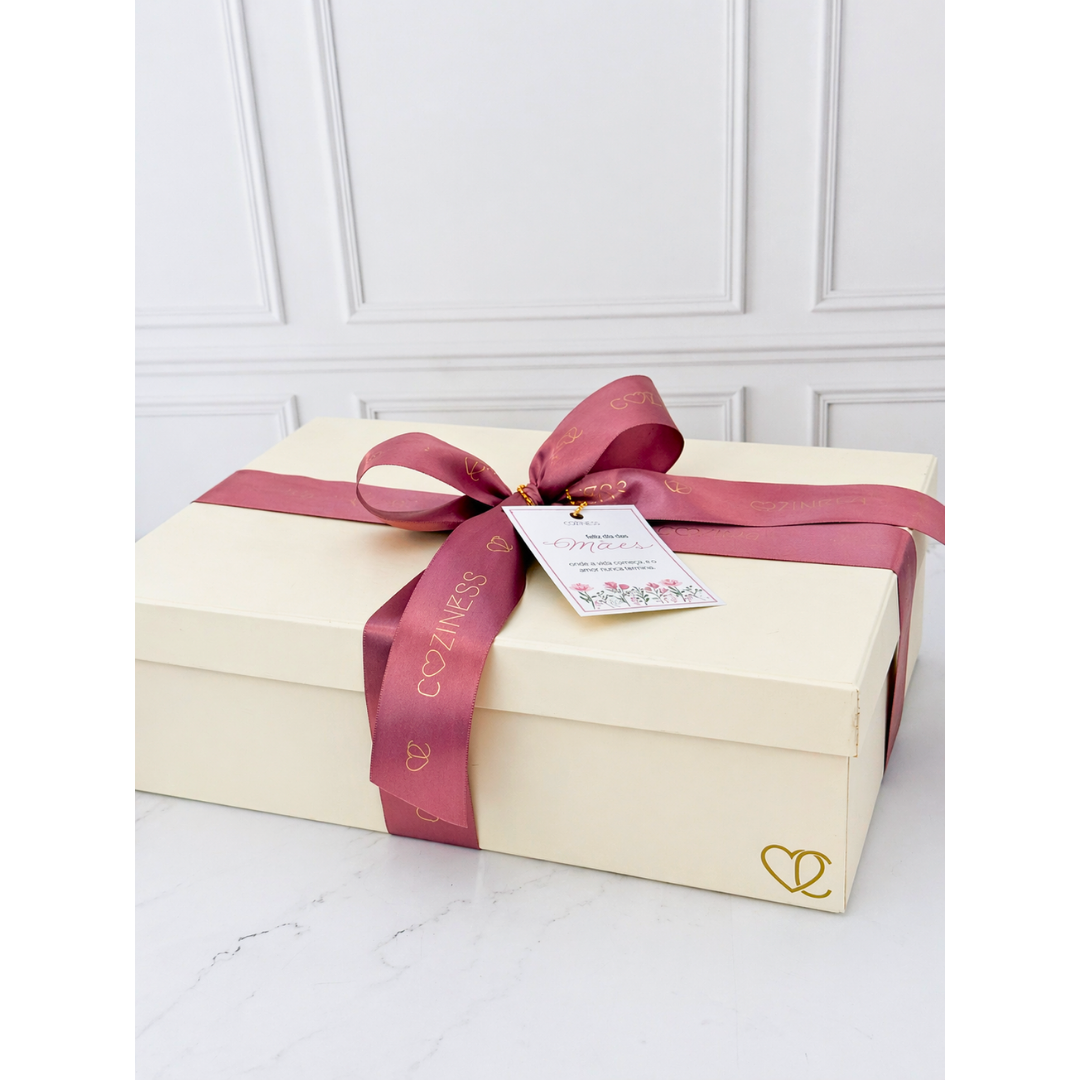 A combinação reúne doces, frutas frescas, pão artesanal, café especial e bebida, criando um café da manhã equilibrado e prazeroso. A apresentação em caixa elegante, finalizada com laço e tag, valoriza ainda mais o momento da surpresa e torna o presente ainda mais especial para celebrar quem sempre cuidou de tudo com tanto amor.