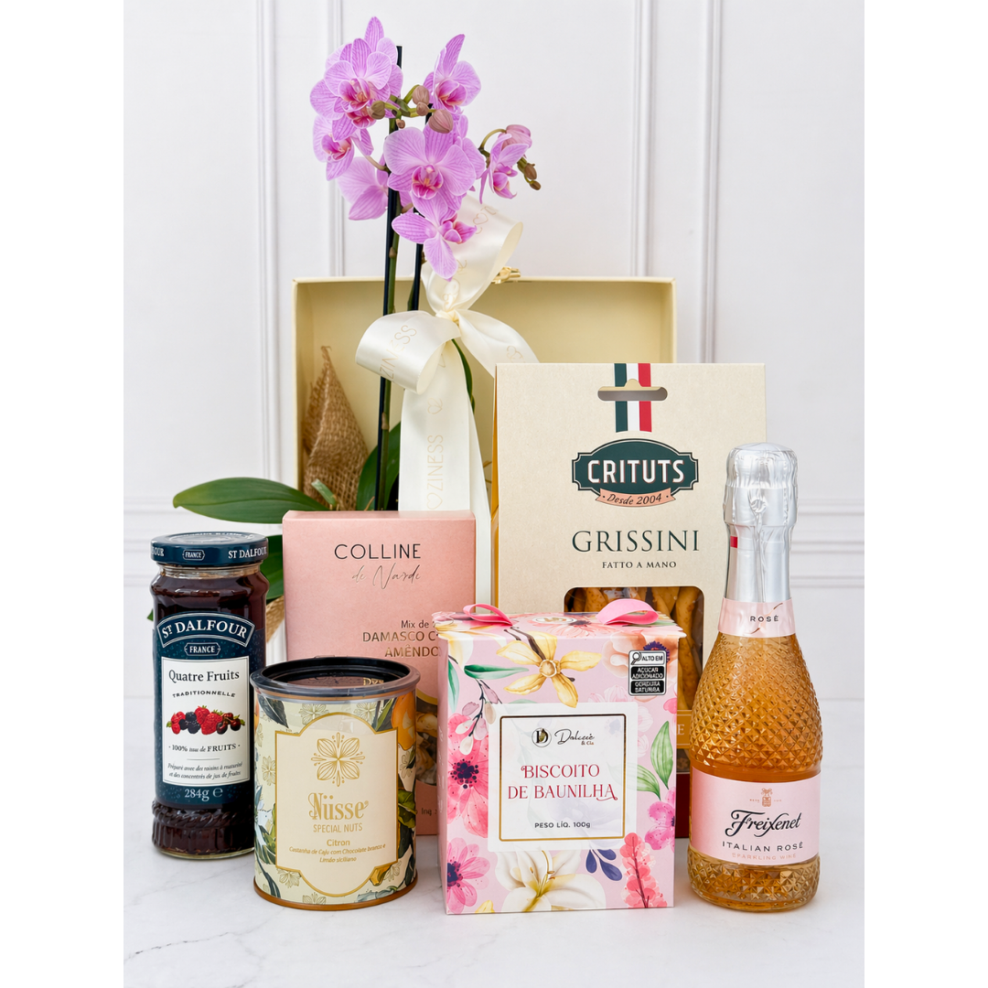 A orquídea adiciona um charme especial, trazendo vida e beleza ao presente, enquanto a maleta marfim valoriza toda a apresentação, tornando a entrega ainda mais impactante. Um presente completo, pensado para encantar em cada detalhe.