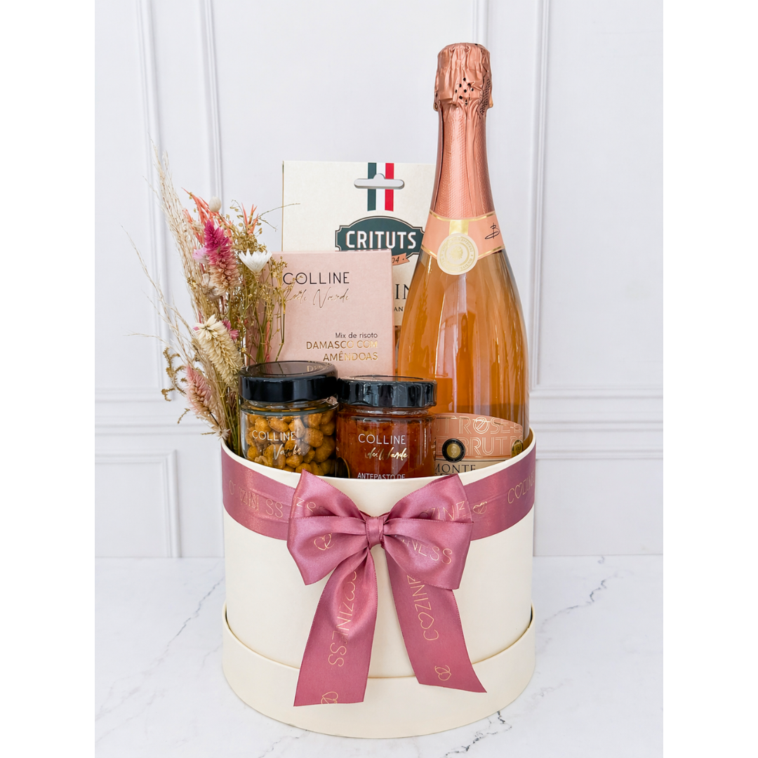 A caixa redonda em marfim reforça a sofisticação do kit, enquanto as flores desidratadas trazem um toque natural e atemporal. Um presente pensado para quem valoriza beleza, sabor e momentos que ficam na memória.